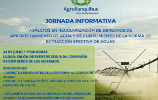 El próximo 24 de julio a las 17:00 horas en el Salón de Eventos de la segunda Compañía de Bomberos en los Muermos se realizará una jornada informativa sobre Aguas para los socios del Gremio. Los expositores serán: Macarena Muñoz, Abogada. Agustín Krogh, Ingeniero Agrónomo. Mario Wulf, Ingeniero Agrónomo