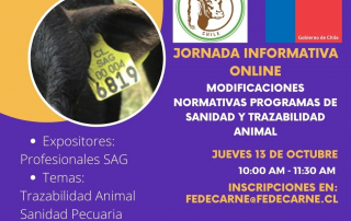 FEDECARNE invita a participar de la Jornada Informativa Online "Modificaciones Normativas Programas de Sanidad y Trazabilidad Animal". Se desarrollará el día 13 de octubre a las 10 am. Profesionales del SAG expondrán respecto a los Programas de Trazabilidad Animal, SIPEC web y Programa de Sanidad Pecuaria. Todas estas materias son importantes para el desarrollo de la actividad ganadera.